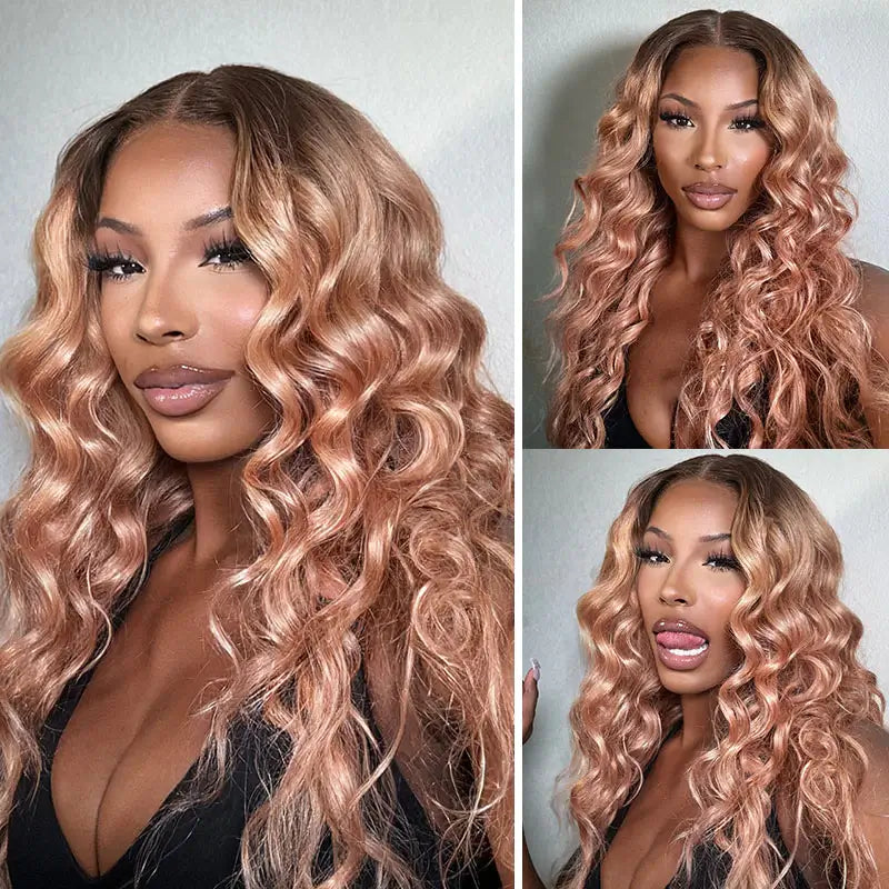 Champagne Rose Body Wave Human Hair with Brown Roots Color Hair Wigs