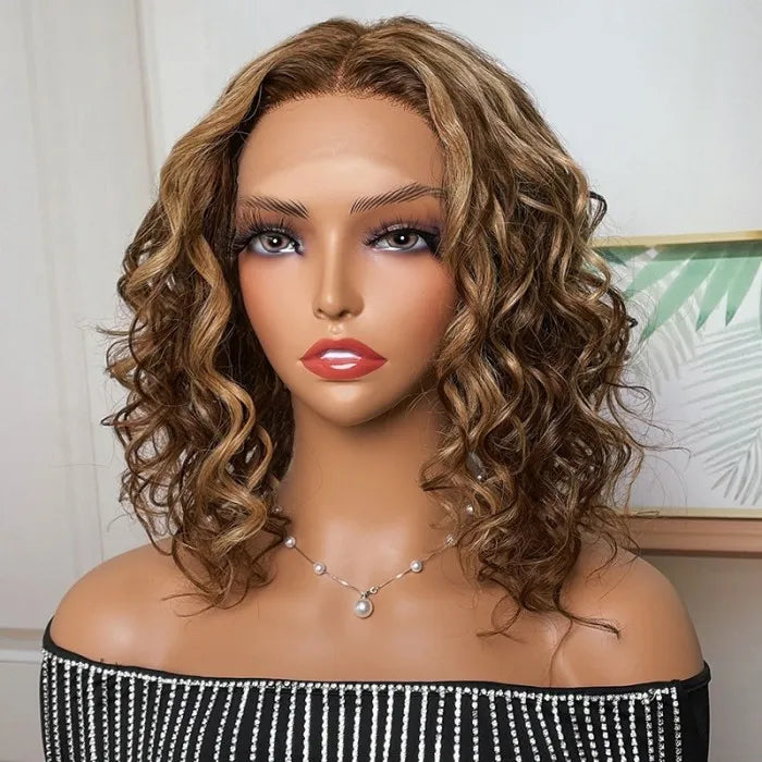 10 Inches Short Wavy Light Brown Lace Part Wig With Highlight And Bouncy Curls | Special Perks